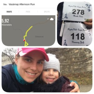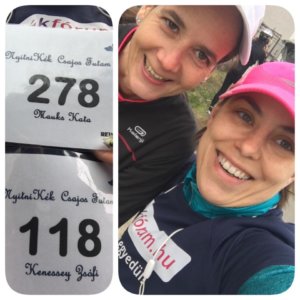 Célegyenesbe értem. Nórit már nem lehetett tovább az esernyő alatt tartani. Elémszaladt és ismét együtt futottunk be a célba. A jól ismert vigyor megint kiült az arcára. Ezért (is) érdemes elmenni ezekre az eseményekre. Nyakába akasztottuk az érmet, de itt a munkánk még nem ért véget. Mentünk, hogy a Kata is részesülhessen a rajongói tábor szurkolásában.
