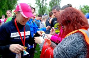 Hiába mondtam neki, hogy bőven van időnk, nem kell sietni, bármikor megállhatunk. Nóri nem akart megállni. Nem is gondoltam volna, de egyben, vagyis megállás nélkül lefutotta mind az 1400 métert. Még sosem futott ennyit. Olyan büszke vagyok rá! Ettől olyan erőre kapott, hogy meg sem akart állni. Azt mondta, menjünk még egy kört. Hát mentünk még egyet. Ebbe már egy picit belesétáltunk, de nem álltunk meg. Gyorsgyalogoltunk. Nem hittem a szememnek. Ez a picilány letolt 2800 métert. Ennél jogosabban még sosem járt neki az érem. Bár ez utóbbit már nem tudta megvárni, mert akkor már nagyon szakadt az eső. Ezért is imádom ezt a nem versenyt. Beültem a kocsiba, hazavittem Nórit, és még simán vissza tudtam menni, hogy újra becsatlakozzak a futásba. Hol máshol lehet ilyet megcsinálni?! Csak Kőbányán. Nóri az érem mellé megkapta még a Linda néni által dedikált rajtszámot is. Volt nagy boldogság.